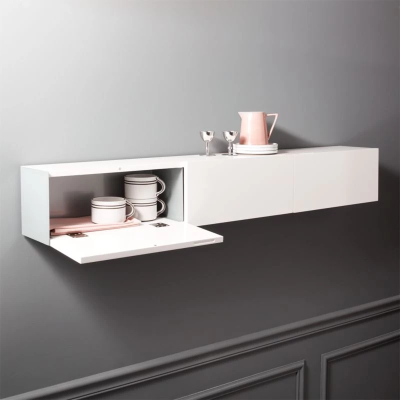Slick hi-gloss white doors flip open to surprise with grey powder-coated steel walls designed by Diana Lu of Slate Design. White lacquered engineered wood with super-thin grey sides that hint at the interior. Use solo, stacked or ganged down the wall. Designed to be extra long for extra storage, shelf frees up floor space in dining, entry, hallway, bath, bedroom. Learn more about Diana Lu on our blog. CB2 exclusive.