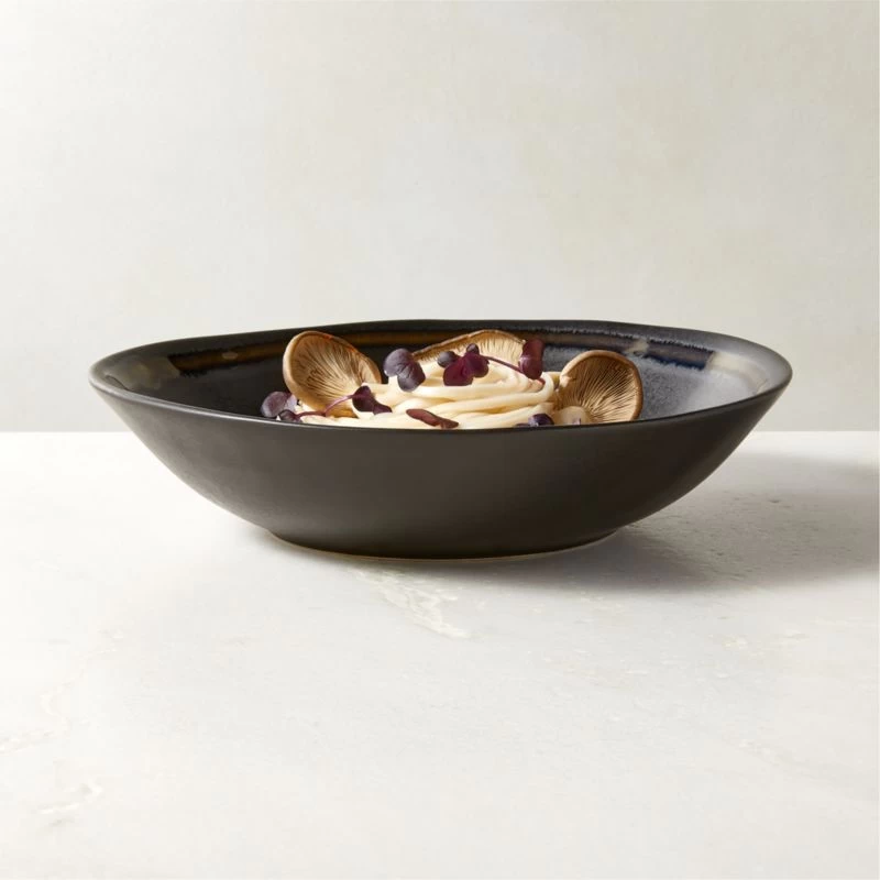 Striking black stoneware pasta bowl is carefully shaped and finished by hand, then given a reactive glaze along its rim. An additional firing achieves a subtle yet eye-catching gloss that reveals understated tonal variations. Each handmade piece will have subtle differences that highlight the artisanal quality and creative process. CB2 exclusive.