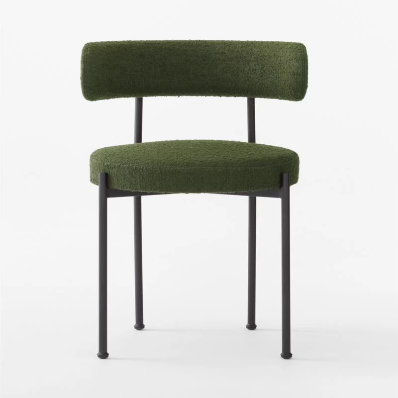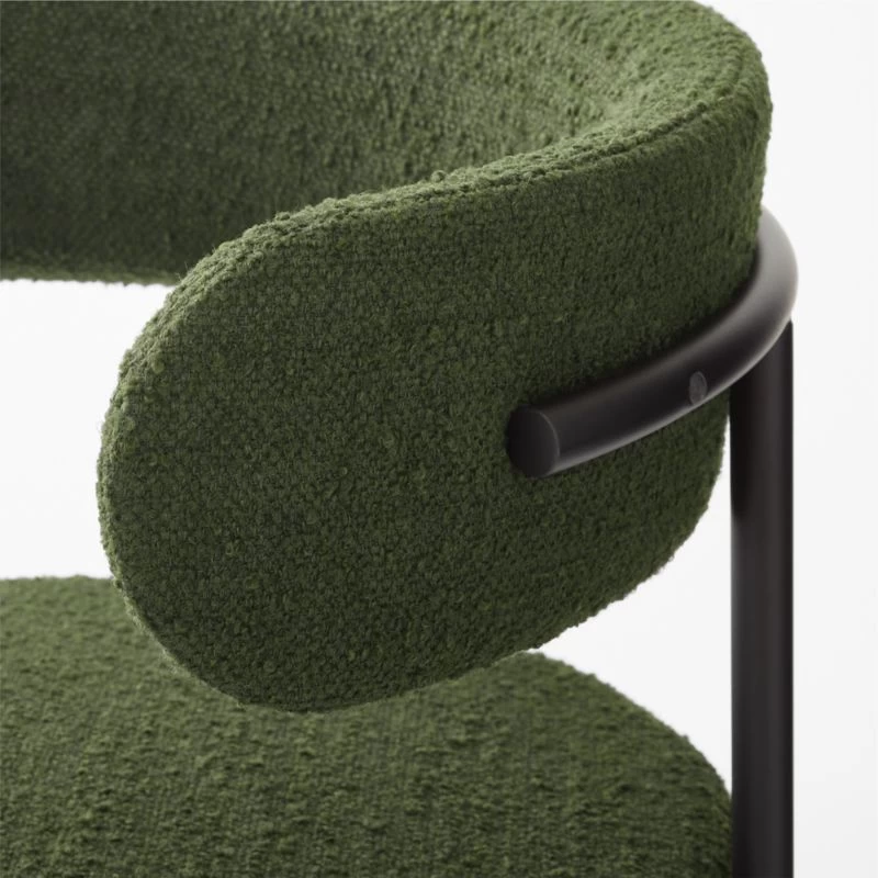 Designed by Omar De Biaggio, steel tube with a matte black powdercoat frames a modern, Italian-made dining chair. Textural dark green boucle wraps the curved back and round seat in luxe contrast. CB2 exclusive.