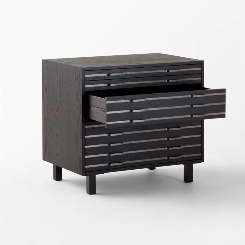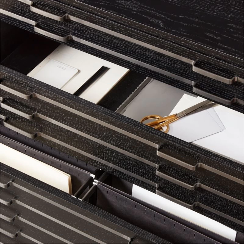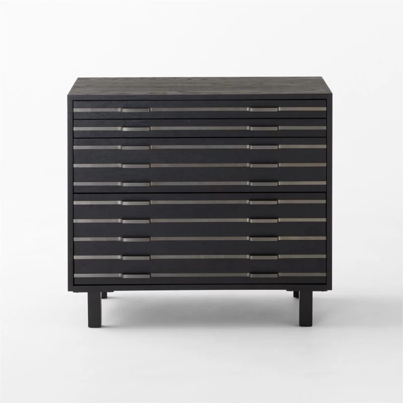 “Familiarity reigns and favorites are reimagined with a splash of LA cool and a fashion edge,” says Fred Segal of their eclectic approach to furniture design. Take this mixed-material file cabinet fronted with stripes of blackened nickel inlay. Inspired by vintage flat-file cabinets with tons of tiny drawers, our modern version has only four: two small, one medium and one large for hanging letter or legal files. CB2 exclusive.