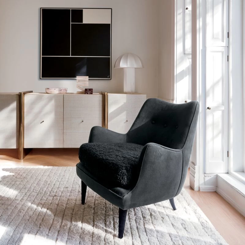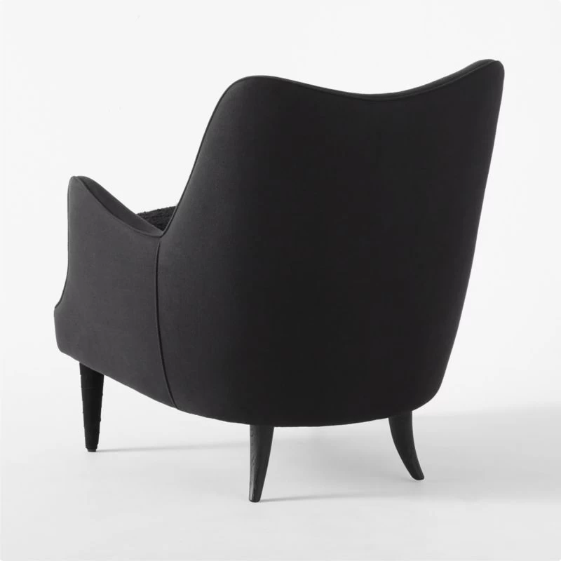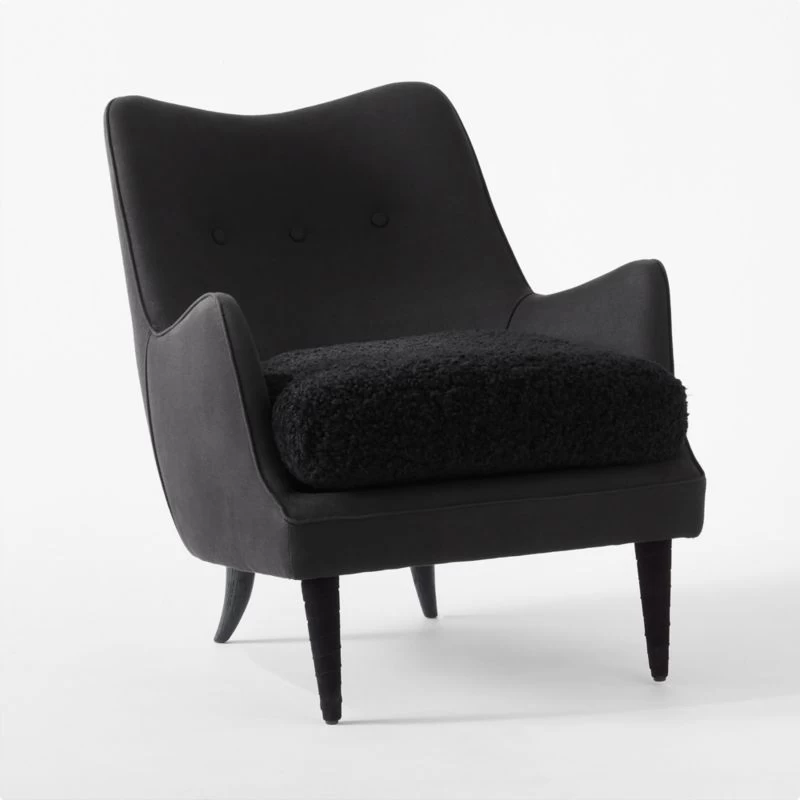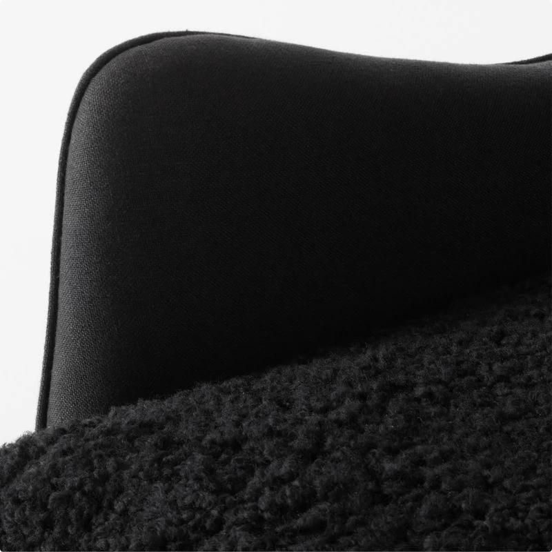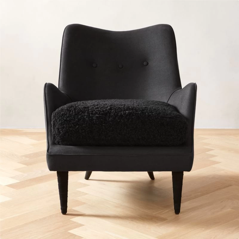 In true Ross Cassidy fashion, this black linen chair takes a conventional silhouette and flips it on its head—and by head, we mean a seat cushion upholstered in real shearling and a frame of FSC ®-certified wood. A variation in feet only adds to the charm, with the front wrapped in black suede and the back shaped like horns. CB2 exclusive.