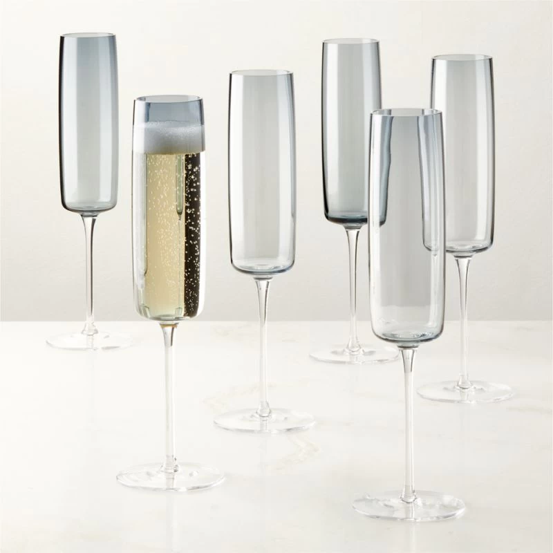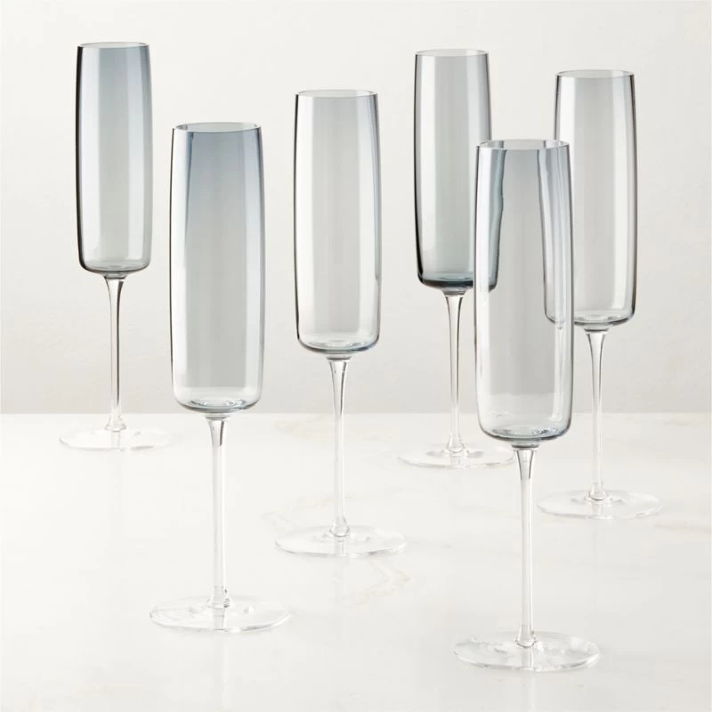 Handmade champagne flutes with elongated, straight sides and soft round detail on the bowl offers crisp sips from a fine, hand-polished rim. Set includes six midnight blue champagne flutes. CB2 exclusive.