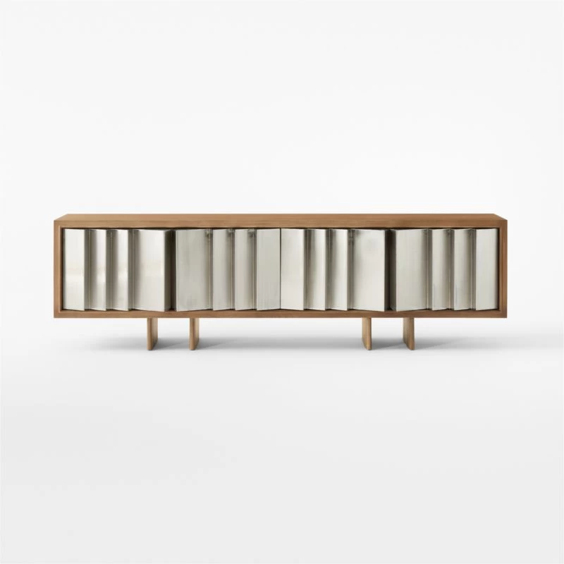 Kravitz Design combines metal and wood into a striking statement piece. Combining French industrial and Brutalist inspirations, elongated oak frame artfully contrasts with sculptural metal doors for a style both raw and refined. Inside offers ample storage and discreet cord cutouts. CB2 exclusive.