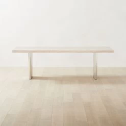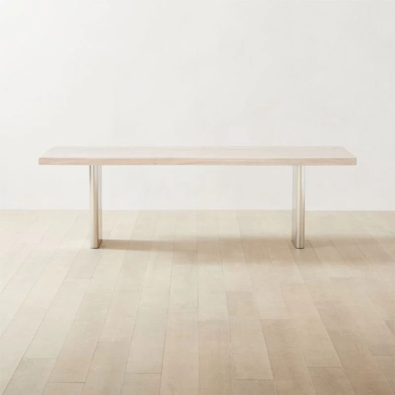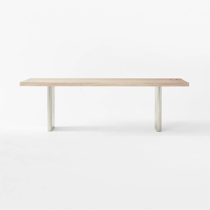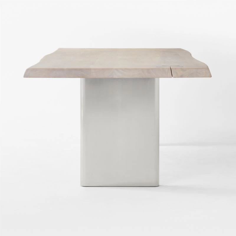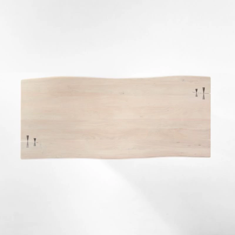 Wide acacia wood planks top off this natural beauty. Finished with a live edge and subtle whitewash, dining table shows off gorgeous natural tones, knots and markings. Two stainless steel legs hold strong underneath while butterflies bridge the splits to call attention to every detail. Seats eight easy. Learn more about Caleb Zipperer on our blog. CB2 exclusive.