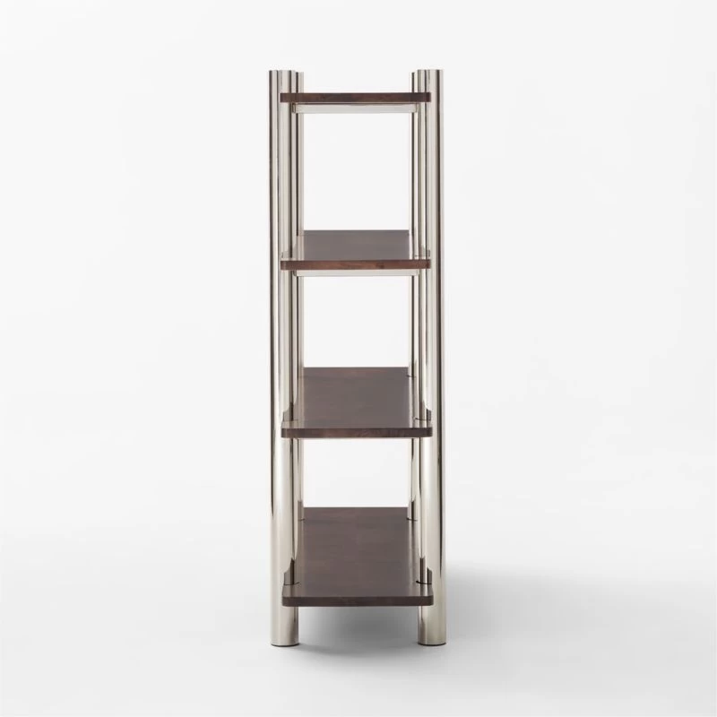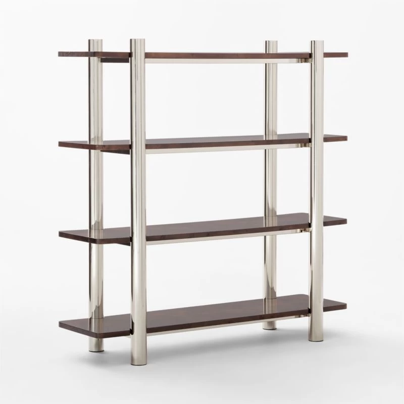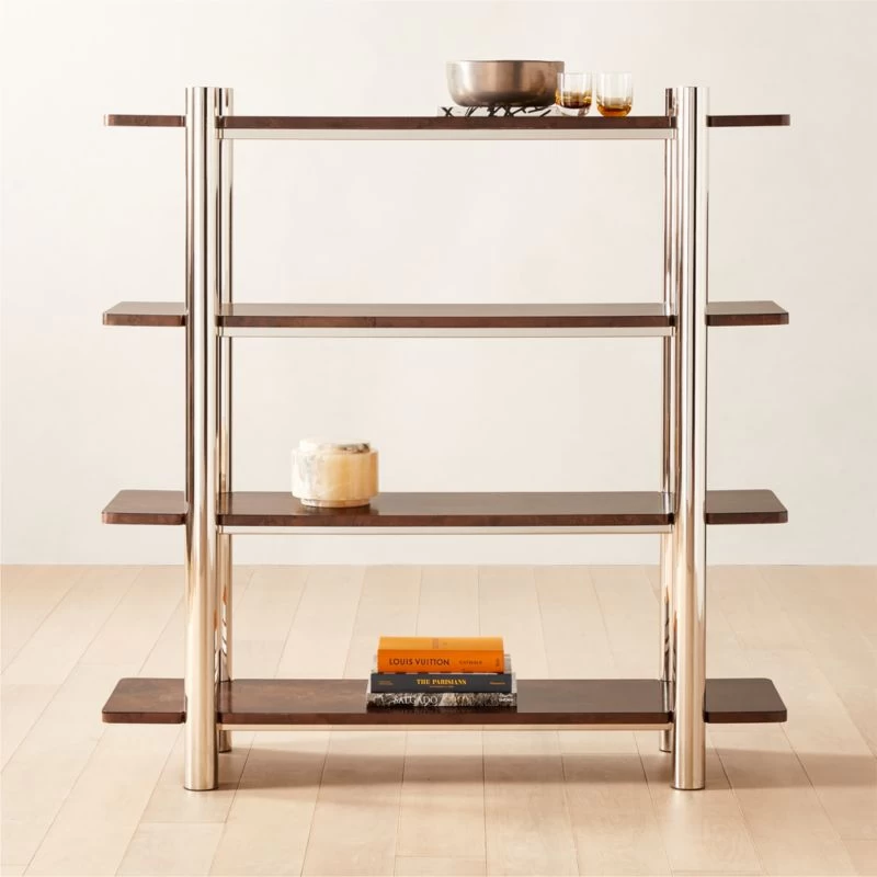 Bookshelf designed by VUUE mixes contrasting materials to create a cohesive, compelling piece. Rich brown stained burl wood veneer shelves have natural whorls and grain patterns, making no two shelves exactly alike. Long tubular columns of polished stainless steel provide the right amount of modern ’70s glamour. CB2 exclusive.