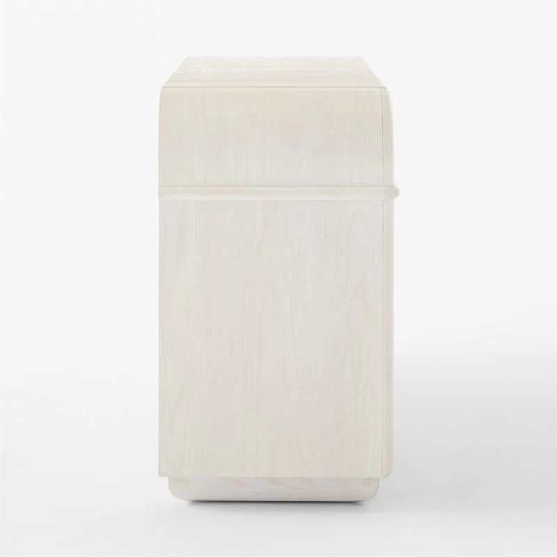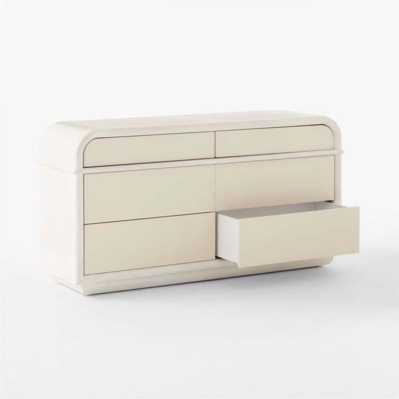 White wood dresser by Brett Beldock alludes to the ’80s with a curved silhouette, but its ivory nappa leather drawer fronts are pure modern luxury. Made with mindi wood, its push-to-open drawers on glides reveal abundant storage within. CB2 exclusive.