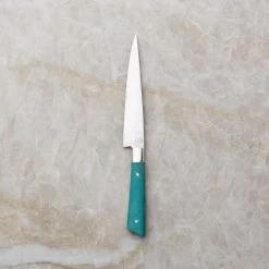 Handcrafted by Tony Bones, the founder and sole artisan of Lockjaw Knives, utility knife is skillfully shaped from high-carbon steel bars. Each blade is heat-treated and fitted with a micarta handle. The more the knife is used, the more the blade develops a blue-grey patina that deepens with age. Great gift for the chef. CB2 exclusive.