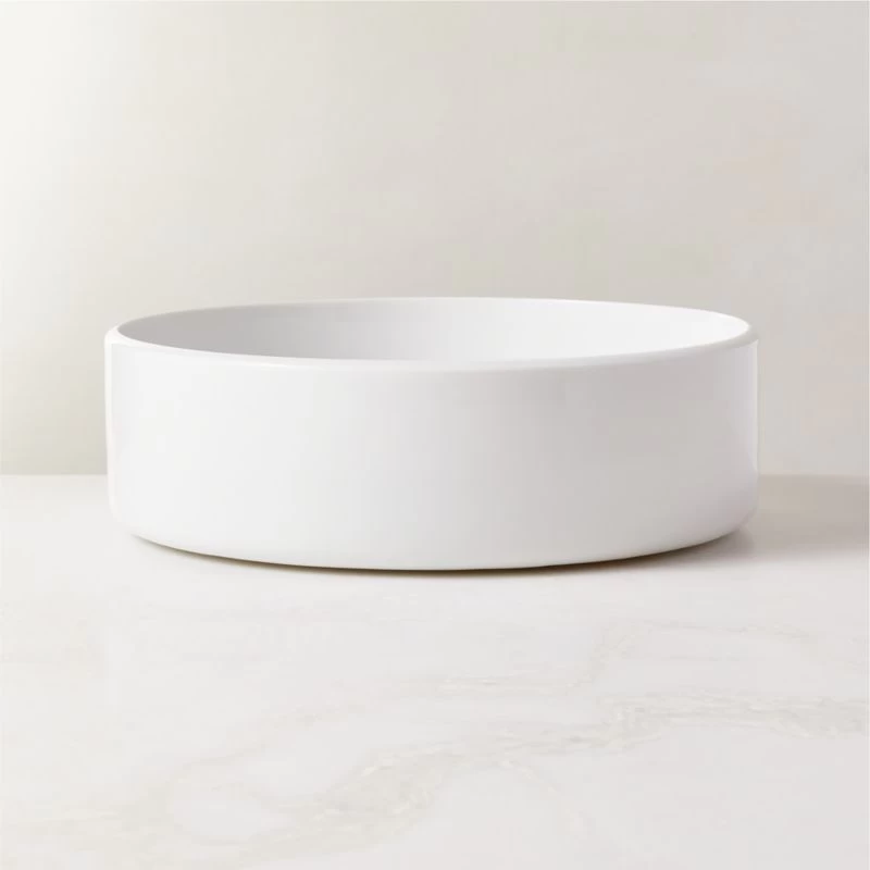 Shiny white porcelain bowl features a tapered rim detail and modern round shape. The straight-sided design adds a certain sophistication that works for everyday dining and special occasions alike. Part of the Mack dinnerware collection. CB2 exclusive.
