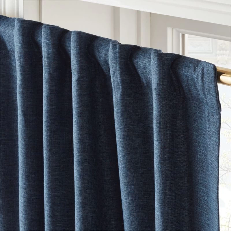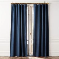 Deep blue silk and viscose blend panel drapes a slubbed texture on the windows that feels organic and earthy. Hangs naturally from back tabs, rod pocket or drapery hooks. CB2 exclusive.