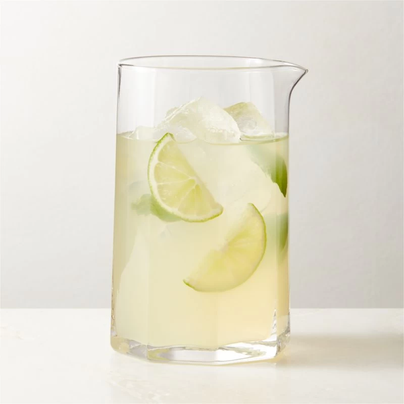 Faceted details of Jannis Ellenberger’s glass pitcher create a unique shape, while the cut rim makes for one smooth pour. Handle-free silhouette and hand-blown glass make each and every piece special. CB2 exclusive.