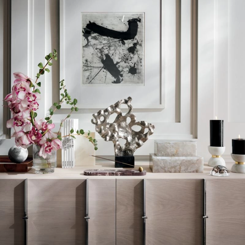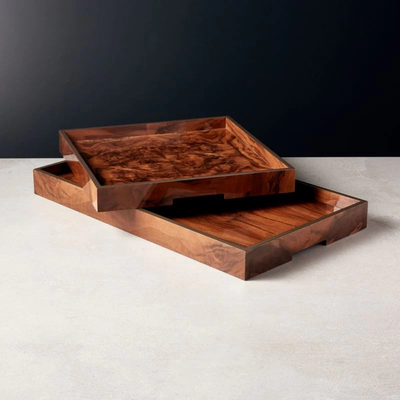 A deeper, darker take on our popular burl wood serving trays. Glossy burl wood lacquer is bordered in tonal brown for a design twist. Rectangular tray works to store and display necessities, while cutout handles underneath make for easy carrying. CB2 exclusive.