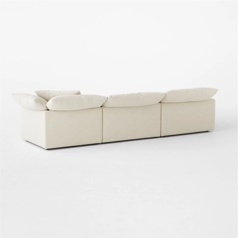 Low, oversized linen sectional sofa is casually chic while maximizing comfort.. Double-stacked pillowy seat and loose cushions throughout are upholstered in a natural-toned, easy-care performance linen blend, creating an unbelievably soft place you’ll never want to leave. Combine it with other Mattea pieces to create a sectional to fit your space. CB2 exclusive.