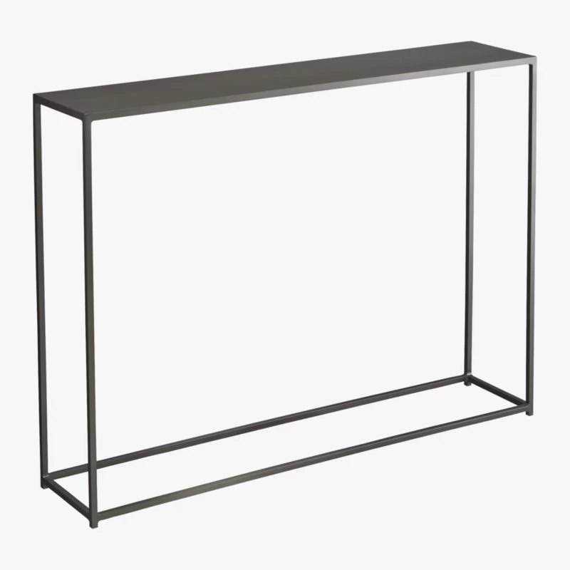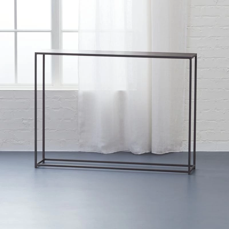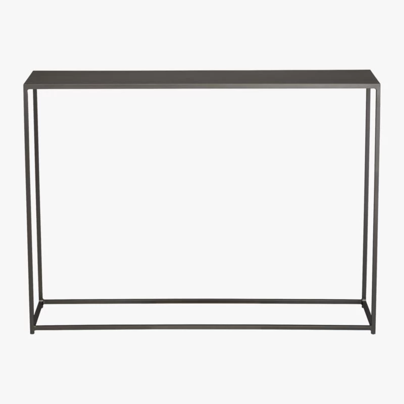 Sleek span of silver powdercoated iron slicks up the entry, backs the sofa, or even subs as a bar or cocktail buffet. Compact construction lives comfortably in small spaces.