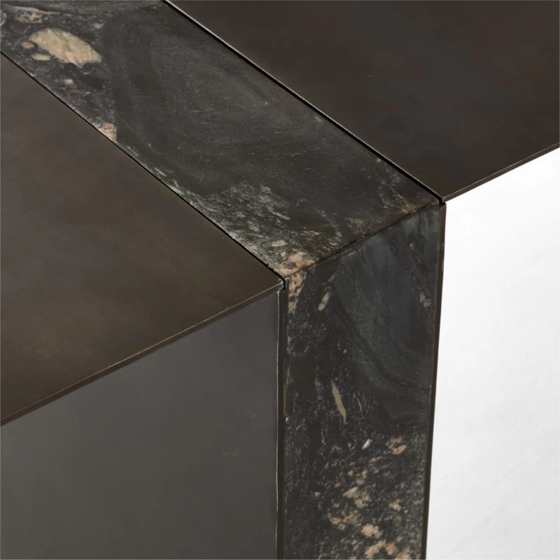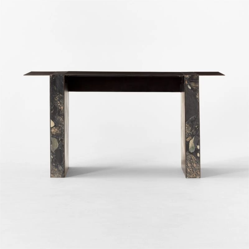 Designed by Mermelada Estudio in Barcelona, the Brutalist influences of this sleek black desk are highlighted by the material mix. Crafted by hand, its oversized panels of active black marble are held between steel sheets showcasing a dynamic ionized zinc finish. As marble is a natural material, the texture and tone of each piece will vary, ensuring a stunning piece like no other. CB2 exclusive.