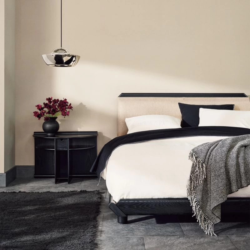 Originally designed in 1987, Gianfranco Frattini’s ebonized ash nightstand highlights his architectural precision and the era’s postmodern flair. The piece’s structural connections double as decorative accents, drawing attention to its overall elegant proportions. A pull-out drawer sits between horizontal upper shelves, while a vertical lower shelf is sized to display books and magazines. Crafted of ebonized ash veneer certified sustainable by the Forest Stewardship Council ®, the surface has subtle wire brushing that brings out the richness of the wood grain. As with the original, our reintroduction evokes appreciation for the intersection of geometry and natural materials. CB2 exclusive.