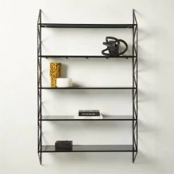Wall-mounted bookcase by VUUE calls to mind a trestle train bridge (hence the name “ponte,” which is Italian for bridge). Black hammered iron rods support five smoked tempered glass shelves. CB2 exclusive.