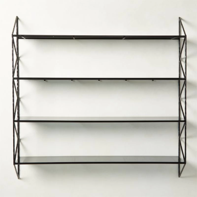 Wall-mounted bookcase by VUUE calls to mind a trestle train bridge (hence the name “ponte,” which is Italian for bridge). Black hammered iron rods support four smoked tempered glass shelves. CB2 exclusive.