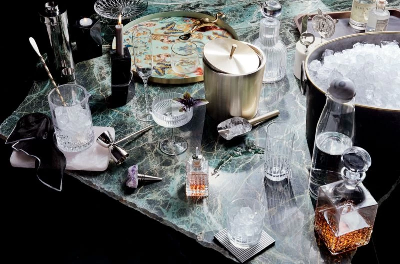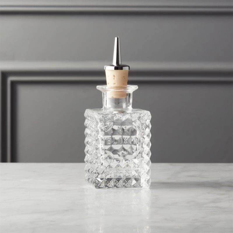 Textured clear glass “elixir” bottle holds bitters and other cocktail ingredients used in small doses. Topped with a cork stopper and plastic spigot for easy dashing and splashing. A total must-have for any bar cart. CB2 exclusive.
