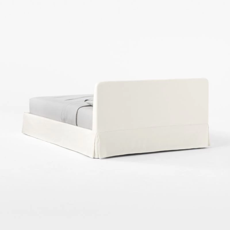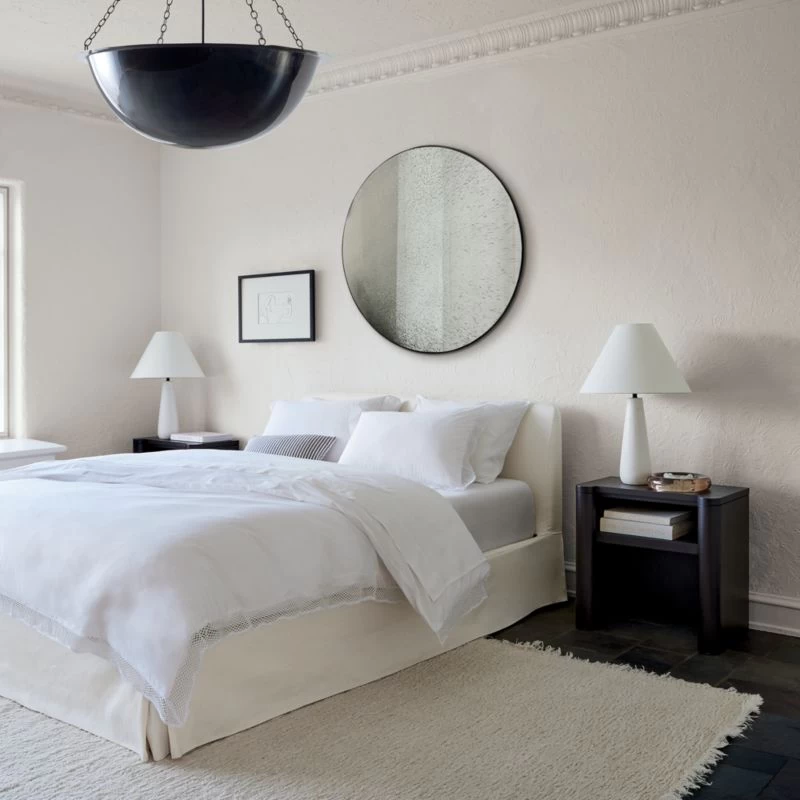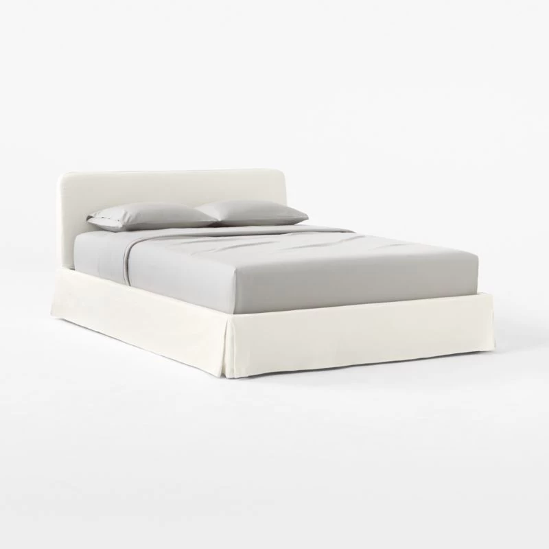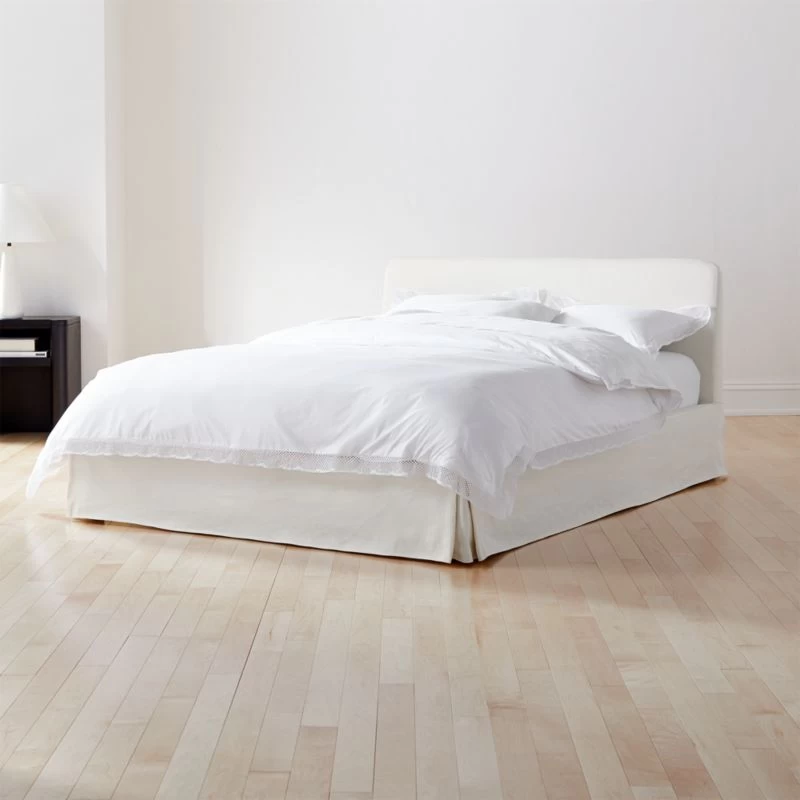 Beauty is in the details of this ivory bed by Kara Mann. One slipcover fits over the entire frame, draping it in luxe sateen. Perfectly tailored box pleats line the corners. “Even when something is simple, it’s those little details that can make it feel so special,” explains Kara. CB2 exclusive.