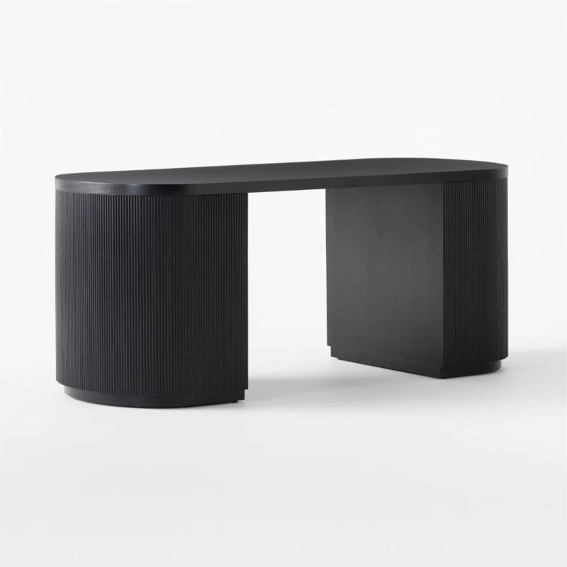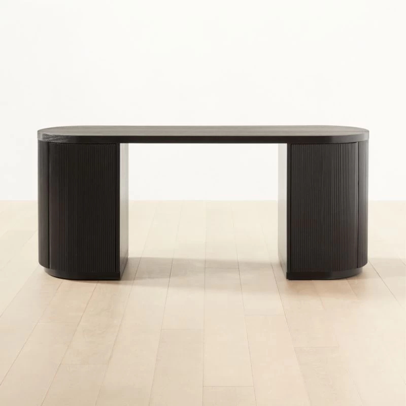 CEO of sophistication, brought to us by Mermelada Estudio. Modern, oversized executive desk in glossy ebonized oak rounds out on either side for maximum storage, one shelf per side. Push-to-open doors curve with the frame and are hidden beautifully with fluted repetition. CB2 exclusive.