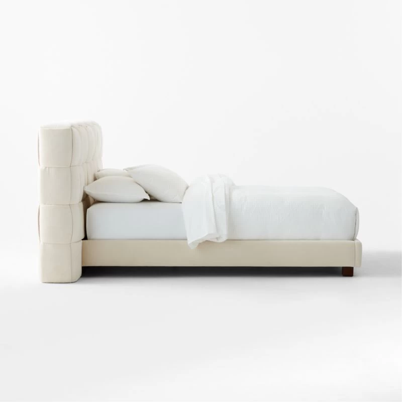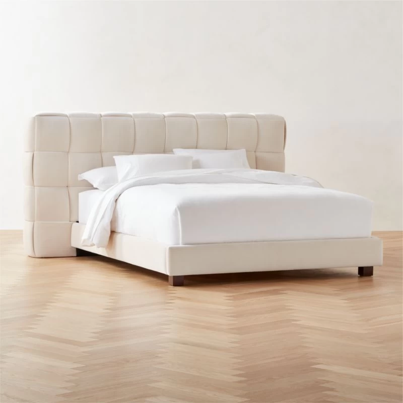 Elegant platform bed by Jannis Ellenberger marries a bold geometric design with the luxurious comfort of velvet. Wide strips of tonal ivory velvet intersect and wrap around the headboard, calling attention to its striking craftsmanship. Characterized by an oversized profile, the padded headboard creates a richly textured landscape for the modern bedroom. CB2 exclusive.