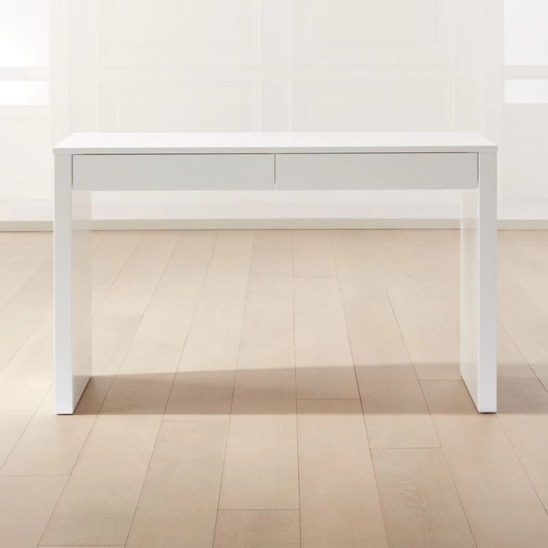 Hi-gloss white lacquer desk downsizes for space but ups the style quotient for office, entryway or bedroom. Discreet sleek dual drawers organize desk supplies and papers, keys and mail (perfect entry console), even cosmetics (makes a great vanity, too). Pair with a modern office chair for a chic and functional space.