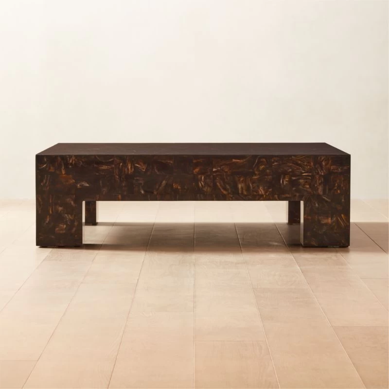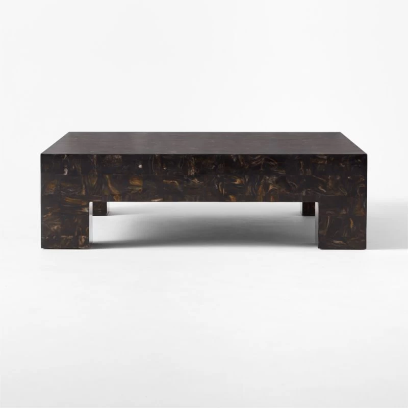 Deceptively simple design is elevated by the look of horn, thanks to the creative team at Barcelona-based Mermelada Estudio. Applied by hand, resin chips feature a brown faux horn finish that brings faraway mosaics and fine craftsmanship to mind. Low profile and thick legs complement a variety of décor styles. CB2 exclusive.