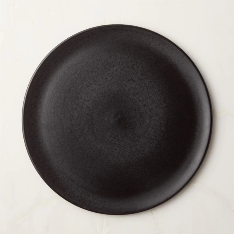 Terra cotta dinner plate is fired with a matte black reactive glaze, surfacing tonal variations and minor imperfections that make each piece unique. Plate lies flat, layering nicely with the other pieces in the Sculpt dinnerware collection. CB2 exclusive.