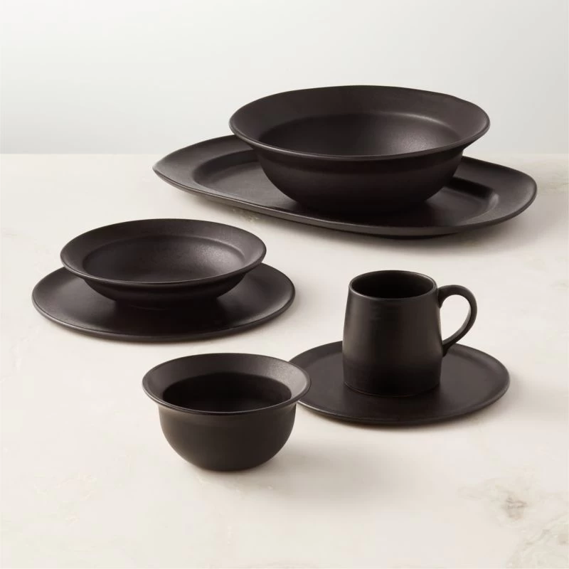 Terra cotta serving platter is fired with a matte black reactive glaze, surfacing tonal variations and minor imperfections that make each piece unique. Oval platter has a flared rim and a large, flat surface that’s perfect for serving holiday dinners. Layers nicely with the other pieces in the Sculpt dinnerware collection. CB2 exclusive.