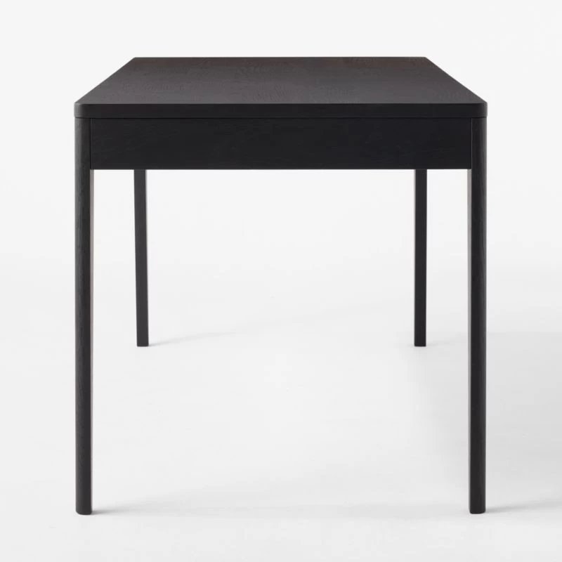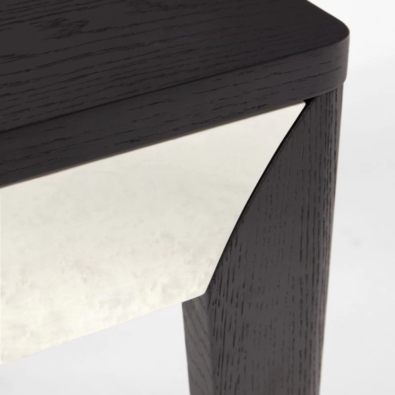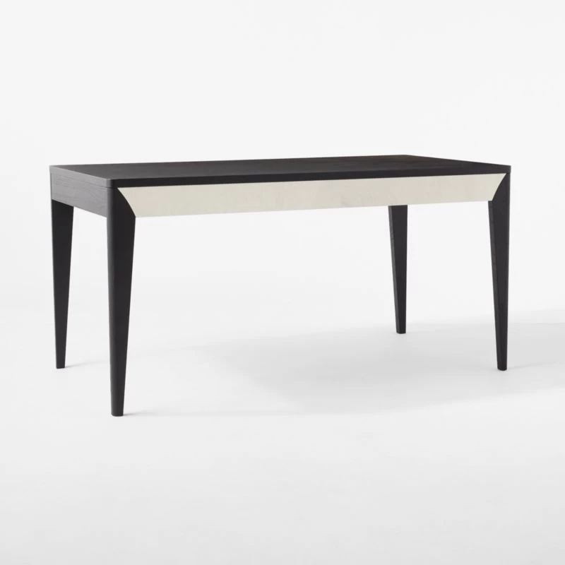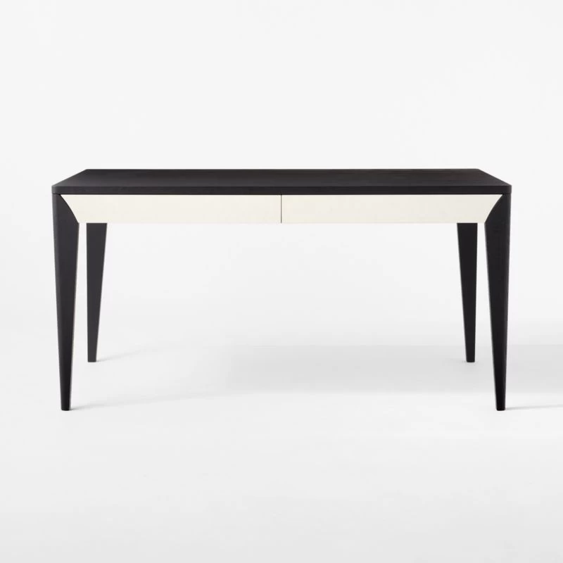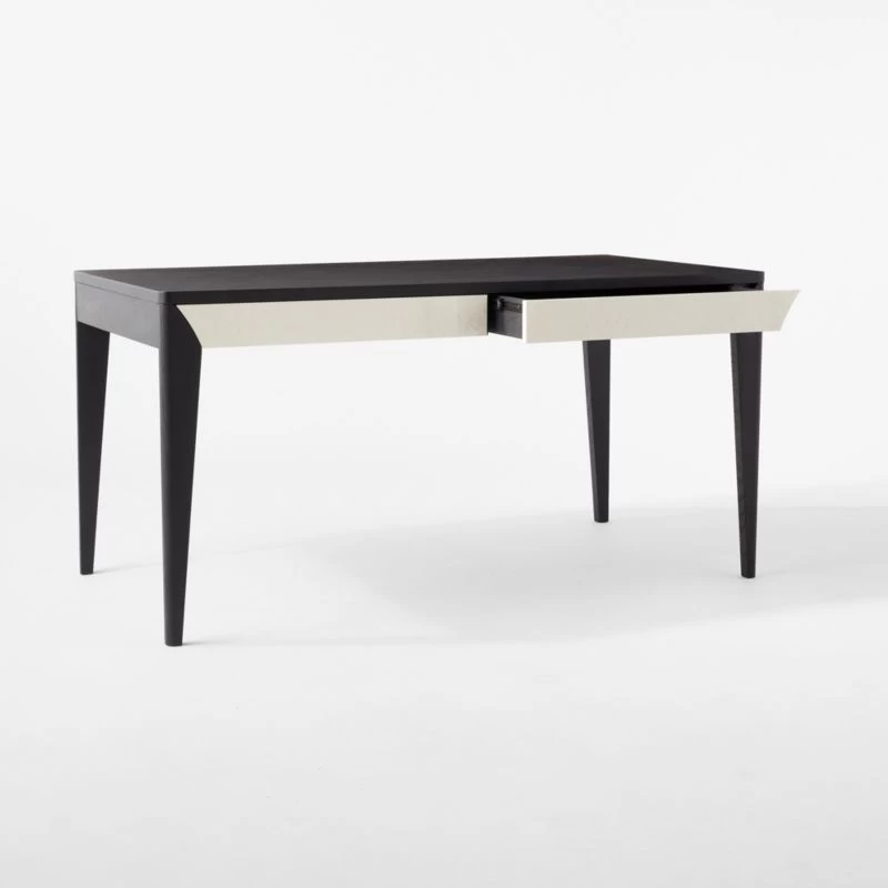 Ebonized oak and high-gloss bleached veneers contrast in this stunning two-tone desk by Mermelada Estudio. Light wire-brushing and dry finish are applied to the black oak veneer frame to emulate true charred wood while two drawers showcase a bleached Pacific madrone wood veneer, a highly active wood known for its lacelike qualities. CB2 exclusive.