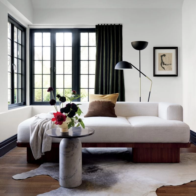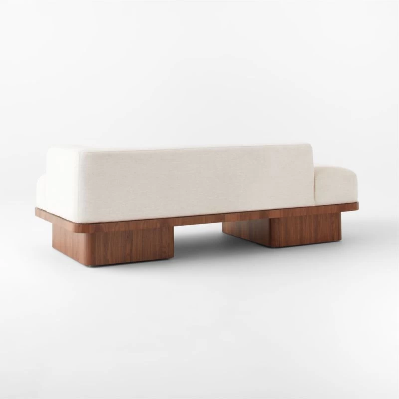 Vintage-inspired daybed by Adam Rogers brings the cool parts of the ’70s back in a generously scaled silhouette. Luxe, white Cypton performance fabric reads like a chenille with a hint of linen while the wood base sports a mid-tone walnut veneer that lets the vertical grain detail shine through. CB2 exclusive.