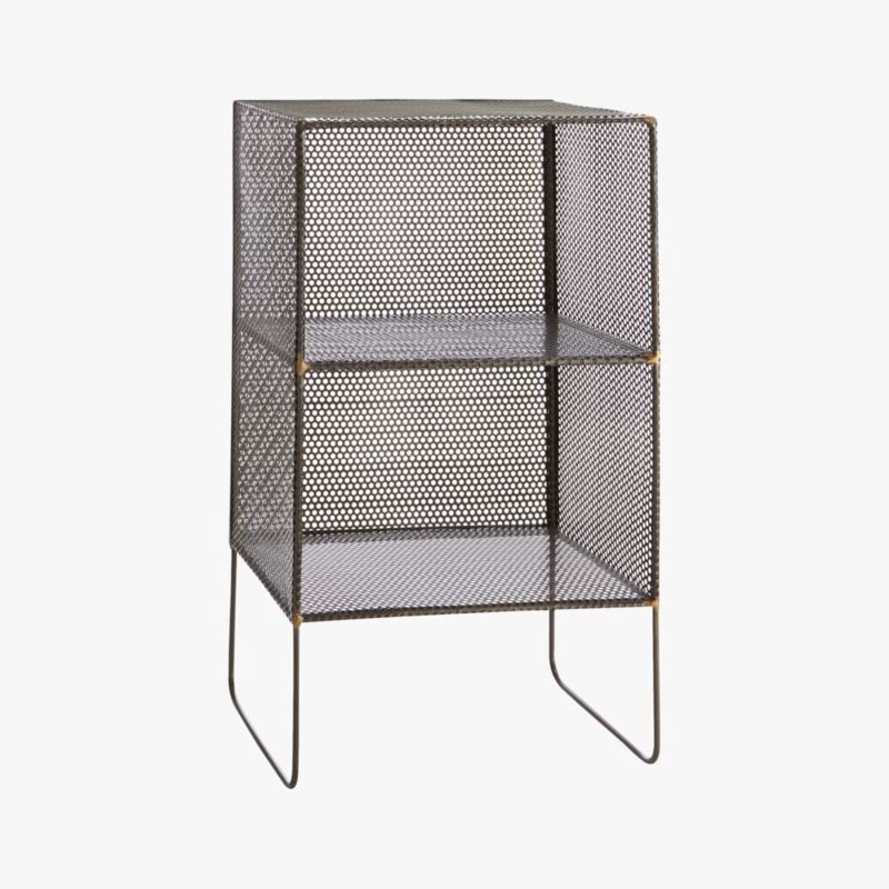 Industrial mesh cubbies rise single file, two tiers tall, on handcrafted iron frame with exposed brass welding. Shelves shoes, books and wine in the bedroom, office, kitchen or entryway. We like to grid the wall with multiples to maximize small spaces. sift gunmetal 2-story tower is a CB2 exclusive.