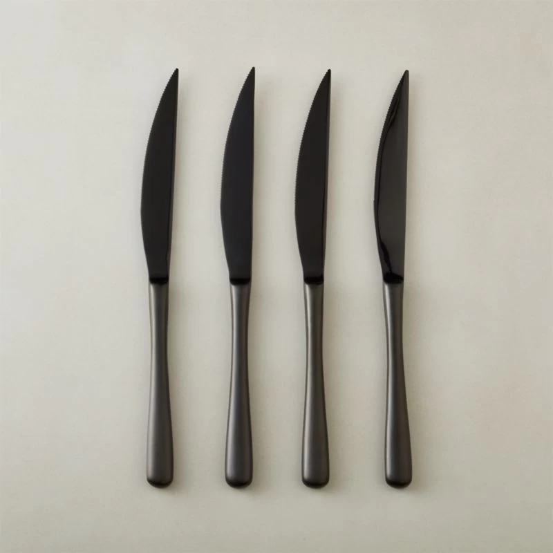Slim-profiled stainless steel steak knives cut filets, NY strips and ribeyes with ease. Shiny black heads top brushed black handles with subtle curved detail. Set of four comes complete with a matte grey storage box, perfect for gifting. CB2 exclusive.
