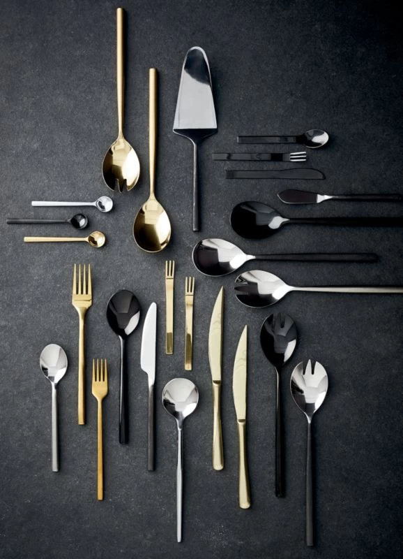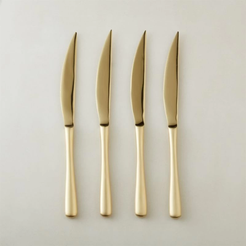 Slim-profiled steak knives cut filets, NY strips and ribeyes with ease. Shiny gold heads top brushed gold handles with subtle curved detail. Set of four comes complete with a matte grey storage box, perfect for gifting. CB2 exclusive.