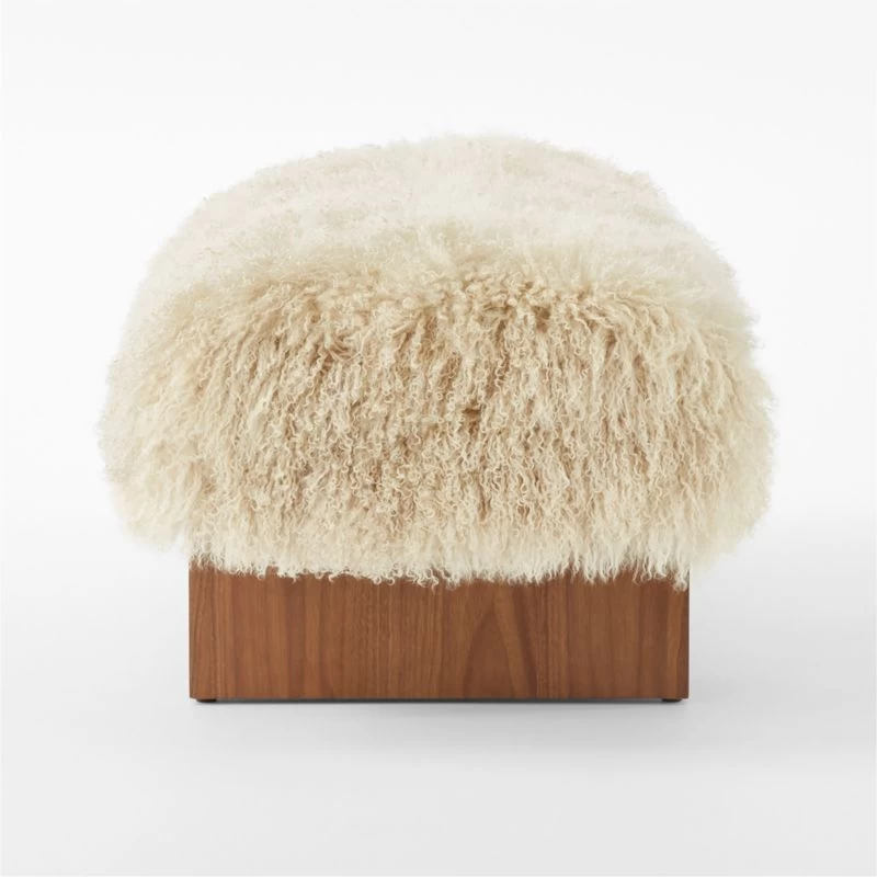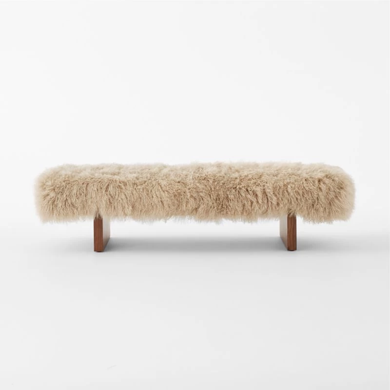 Long bench begins with a base of warm walnut wood, certified sustainable by the Forest Stewardship Council ® (FSC), and is topped by a fluffy overflow of humanely sourced taupe Mongolian sheepskin for incredibly plush comfort. Designed by Gonçalo Campos, bench adds incomparable texture to the entryway, bedroom or living room. CB2 exclusive.