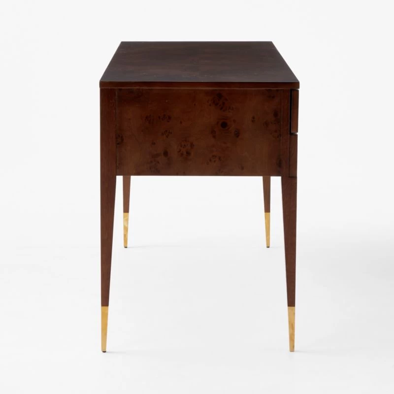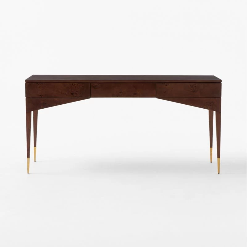 A refined take on the traditional writer’s desk, Nicholas Obeid’s design is versatile enough to serve in the office or entryway. Warm burl wood imparts a subtle pattern throughout, while a narrow silhouette, tapered legs and brass ferrules subtly nod to art deco elegance. Three push-to-open drawers with undermount glides provide smooth movement and a clean, minimalist shape. CB2 exclusive.