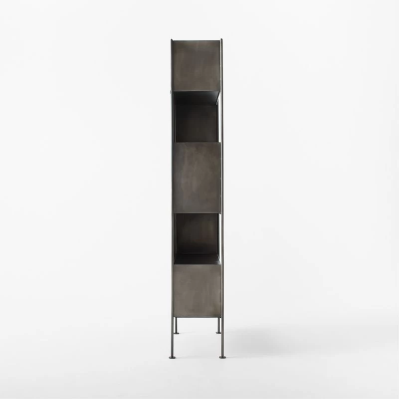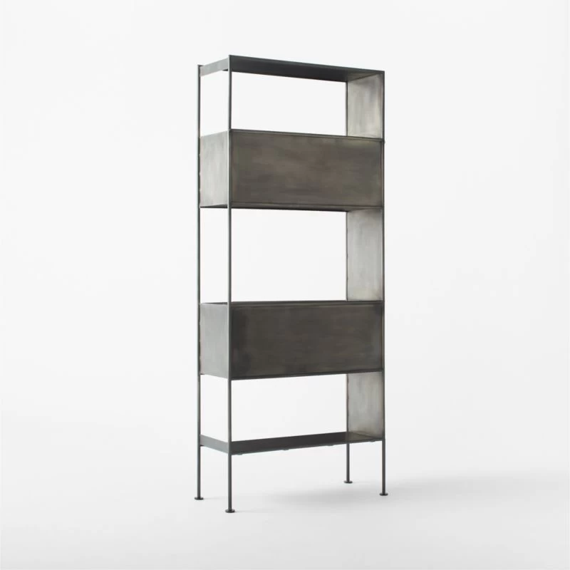 Drawing inspiration from Italian modernism, metal bookcase by Jannis Ellenberger makes an industrial, artful display for books, photos and collectibles. Sturdy metal frame has a powder-coated satin finish that evokes the patina of aged raw steel. Slim legs are anchored by a circular foot detail, which doubles as a leveler for the piece. CB2 exclusive.