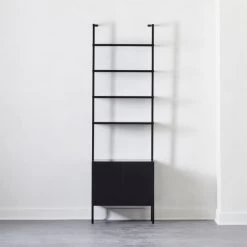 Minimalism scales to the max in a modern rise of black. Four shelves ladder sky high (a CB2 record eight feet) with a cabinet for closed storage down below. Powdercoated aluminum frame with hidden hardware accentuates neutral black construction. Mounts sturdy to the wall and pairs with the Stairway desk and bookcase. CB2 exclusive.