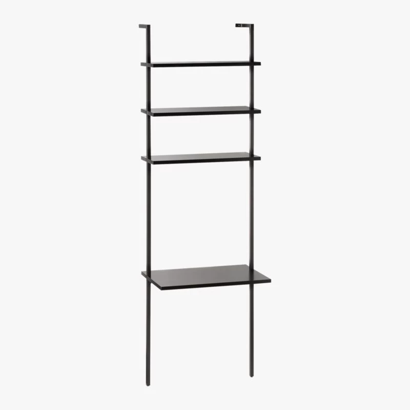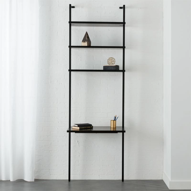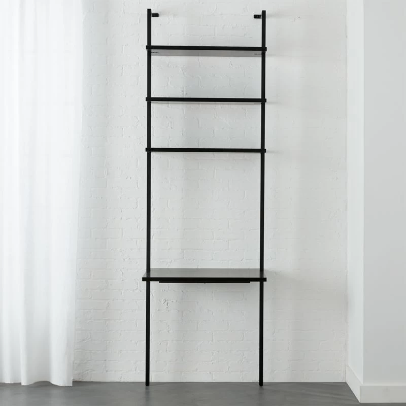 Minimalism scales for small spaces in rich black. A taller version of a CB2 favorite, sleek desktop surface and three shelves ladder up in engineered wood with dark lacquer. Powdercoated aluminum frame with hidden hardware accentuates spotless rise. Mounts sturdy to the wall. Create a vertical library with stairway Black Wall Mounted Bookcase. CB2 exclusive. Pair with a modern office chair for a chic and functional space.