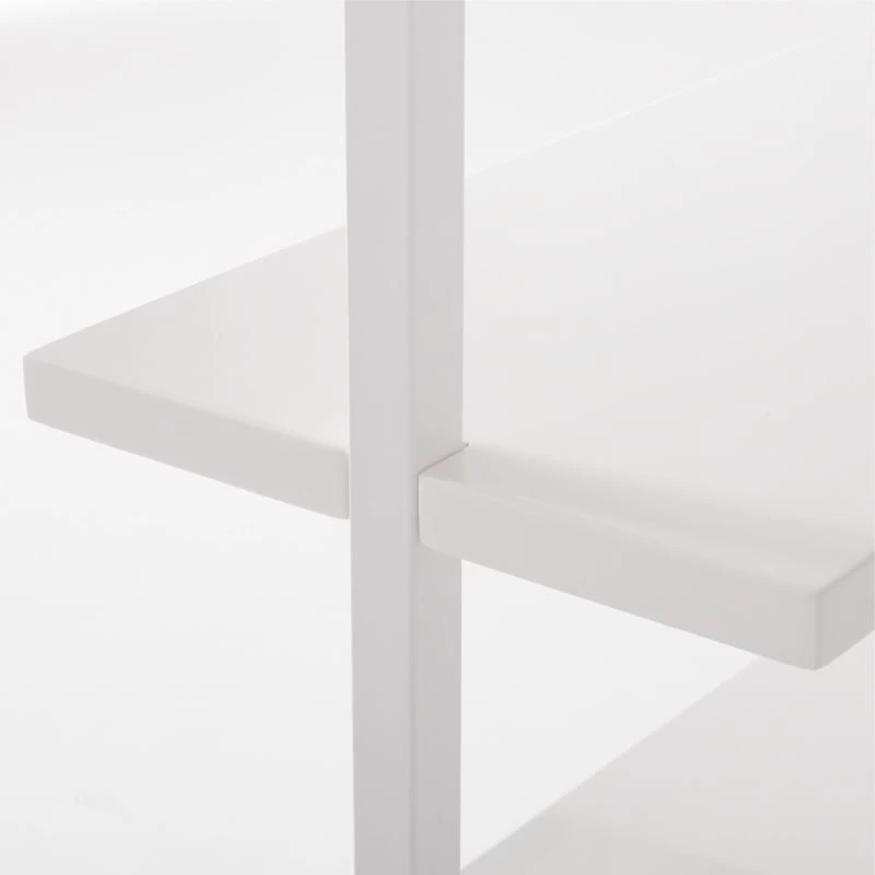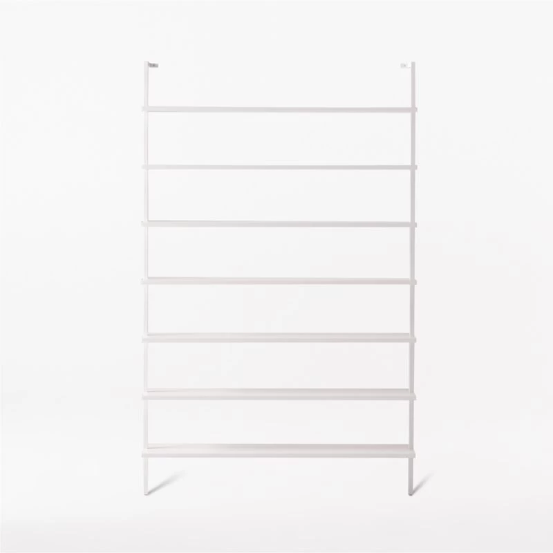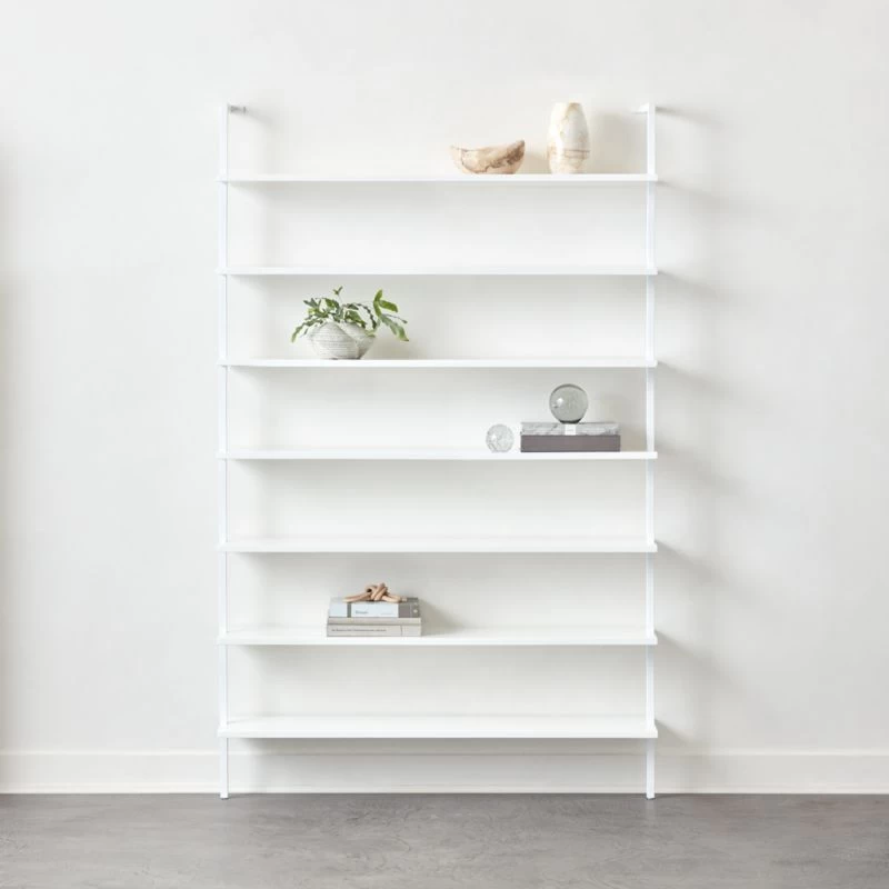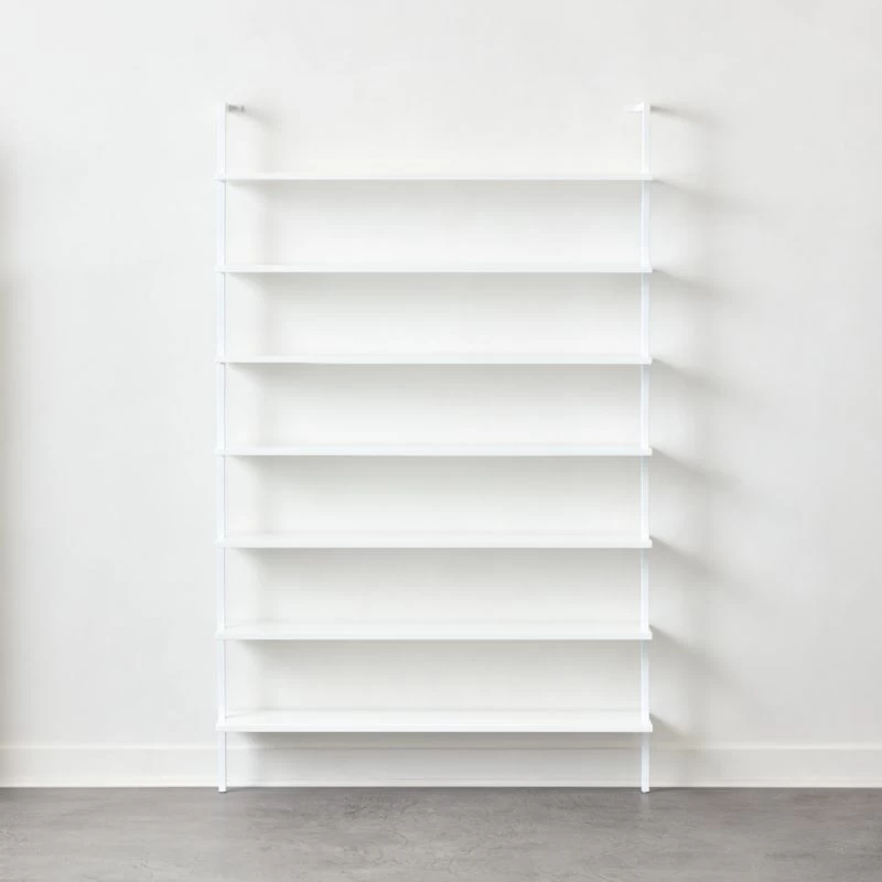 Our best seller goes wide in clean, pristine white. Seven shelves ladder up in glossy white engineered wood while a powdercoated aluminum frame hides hardware expertly. Mounts sturdy to the wall and creates a vertical library in multiples. CB2 exclusive.