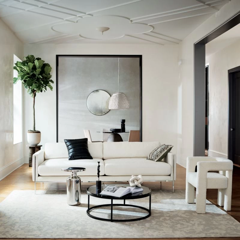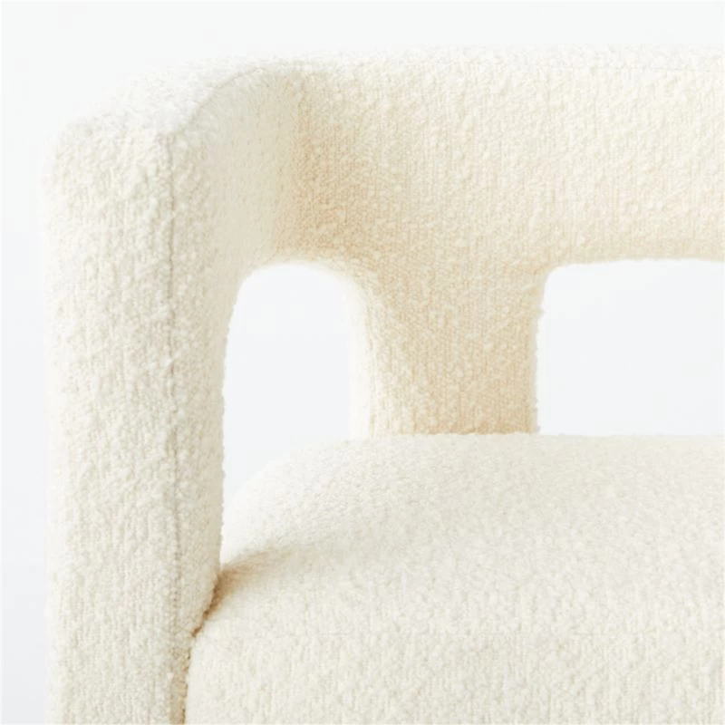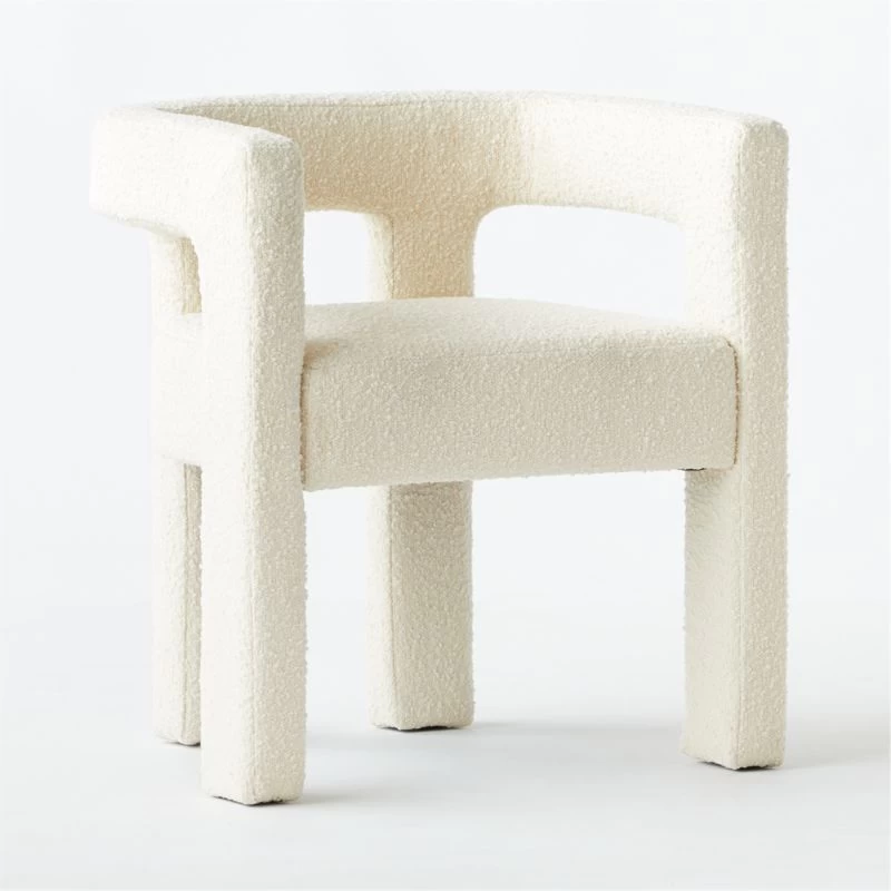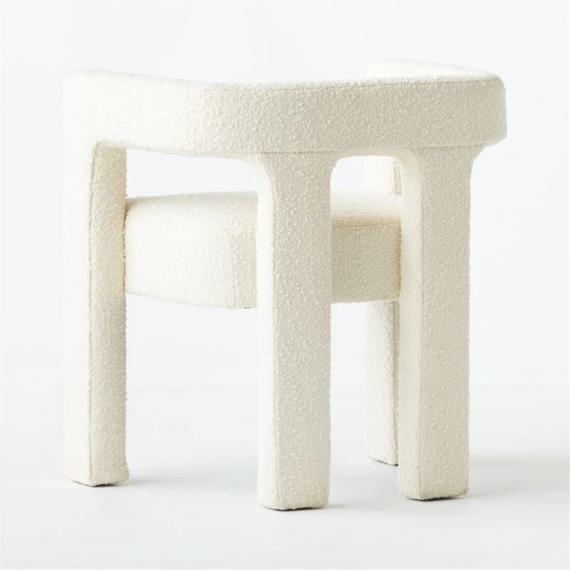 Ivory boucle chair by Caleb Zipperer brings lounge to the table. Architectural in profile and plush all around, seat sits deep with a rounded back for extra comfort. Expect guests to stay a while. Learn more about Caleb Zipperer on our blog. CB2 exclusive.