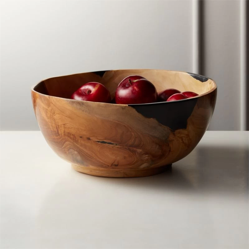 Sized to be used and crafted to be seen. This art-like repurposed wood and resin bowl is hand-formed from teak root, kiln-dried, and filled in with black resin to create a modern mixed-material effect. Each bowl will be unique in shape and resin amount/placement. CB2 exclusive.