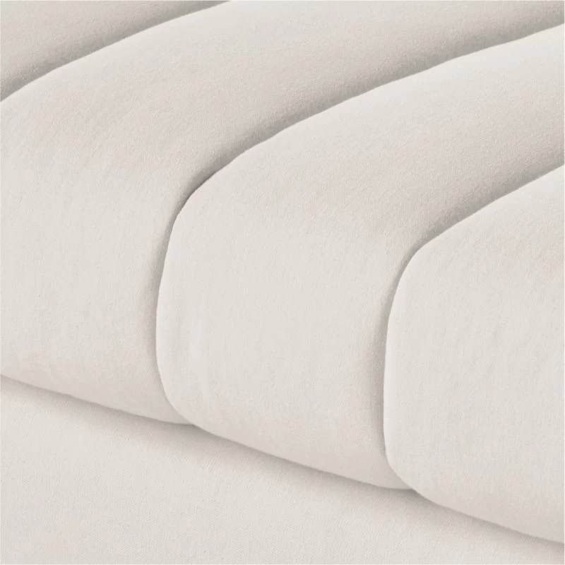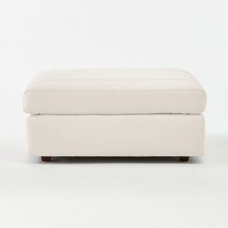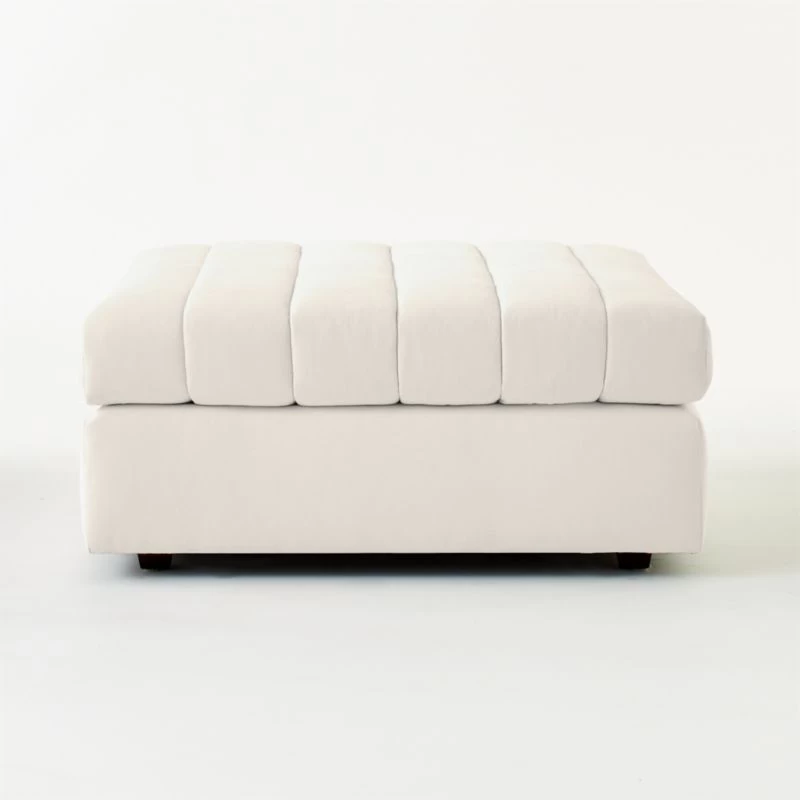Channel-stitched seat cushions create a domestically crafted ottoman that’s big on both comfort and style, all upholstered in natural cotton. “I’m all about the lounge,” confesses designer Kara Mann. “This collection features a softer take on upholstery in general: a little deconstructed, a little bit more casual.” CB2 exclusive.