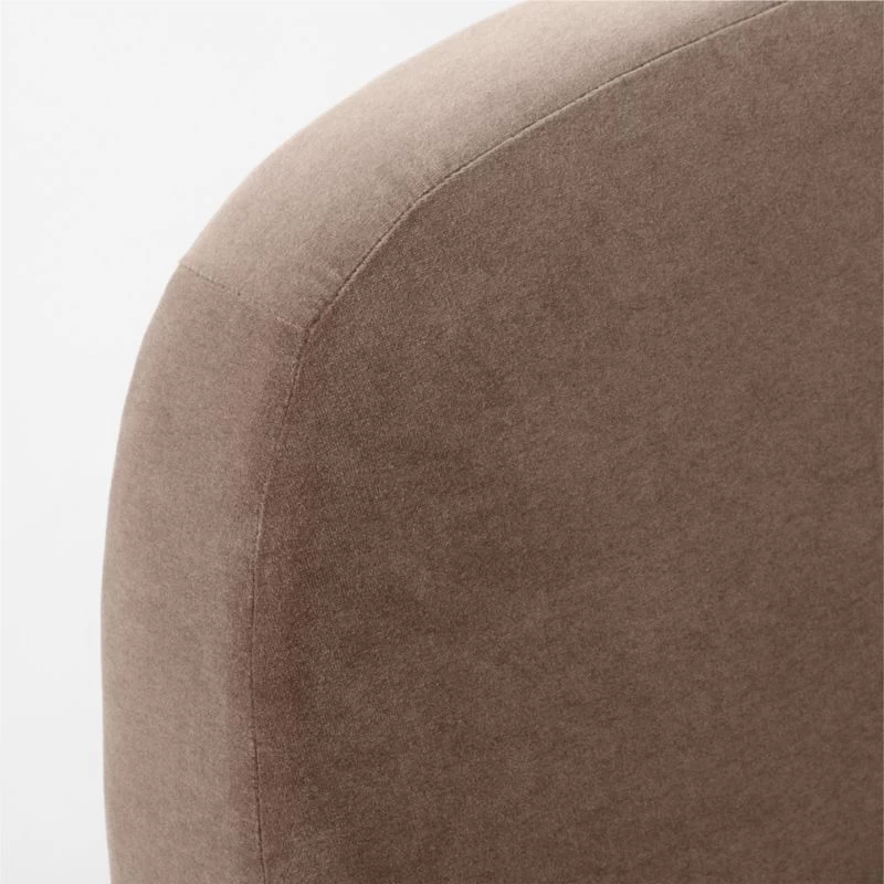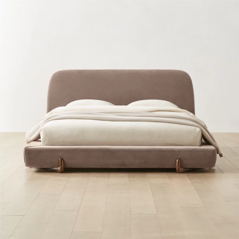 Bed by Jannis Ellenberger echoes Brazilian modernism through soft curves and earthy materials. High-gloss legs, crafted from walnut-colored oak certified sustainable by the Forest Stewardship Council ® (FSC), counterpoise the plush upholstery. Soft cotton/wool velvet in mushroom brown has small flecking for a luxurious, mohair-like appearance and texture that’s utterly sumptuous. CB2 exclusive.