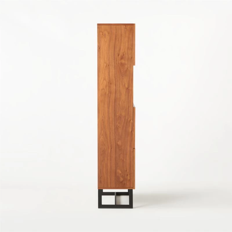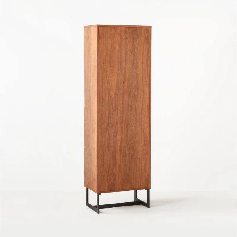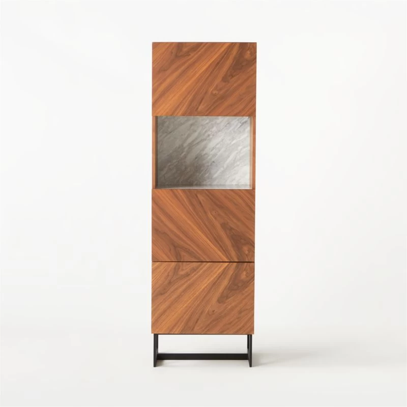 Designed by VUUE, warm walnut veneer frame stands tall with three cabinet doors that open to concealed storage. Precisely cut panels angle diagonally across each door to create an abstract chevron pattern of swirling grains and tones. Single open storage space, coolly defined by slabs of white Carrara-style marble on the shelf and in back, sits cabinet-height. Wood and marble cabinet chicly hides guilty-pleasure reads or serves strong drinks in the living room. Learn about VUUE on our blog. CB2 exclusive.