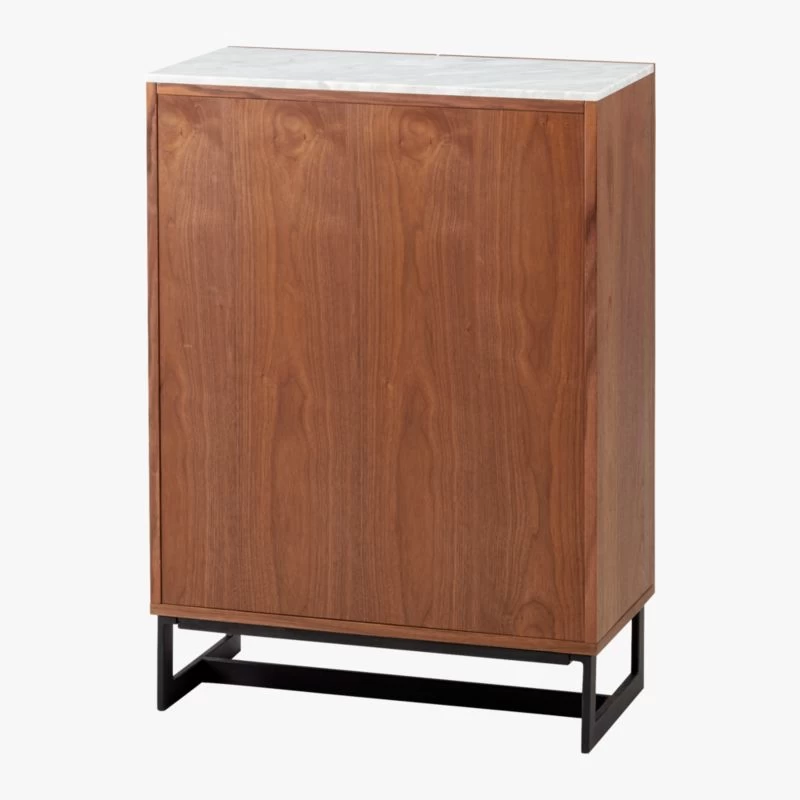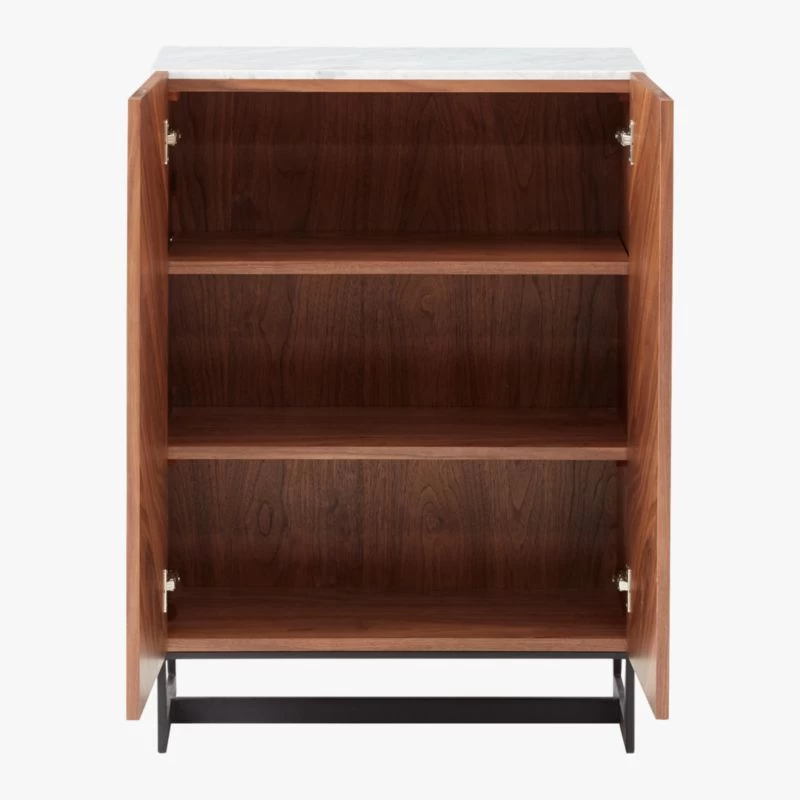 Designed by VUUE, this wood entryway cabinet spotlights the richness of natural materials. Topped with a cool slab of white Carrara-style marble with grey veining and framed by the contrasting warmth of a walnut veneer base. Precisely cut panels angle diagonally to create an abstract chevron pattern of swirling grains and tones on two soft-close doors. Opens to three shelves for storing bags/hats/scarves in the entryway, serveware in the dining room or drinkware and spirits in the living room. Learn about VUUE on our blog. CB2 exclusive.
