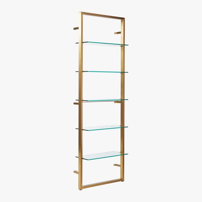 Brass bookcase designed by Mark Daniel of Slate Design draws inspo from the flashier vintage design of the ’50s and anchors it into a sleek, minimalist piece of wall art. Five shelves of tempered glass are fixed to a brushed metal frame and create major drama when repeated down the wall. Stud mounting recommended; hardware included for drywall installation. Learn about Mark Daniel on our blog. CB2 exclusive.