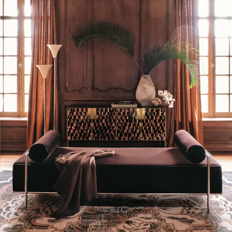 Designed by VUUE, dark acacia wood credenza makes a graphic statement in any living space. Responsibly sourced horn is hand-laid by skilled artisans in India, making each piece truly unique. Four doors open with integrated handles to reveal two shelves inside. Two thin, matte brass-finished legs elevate the piece. Learn more about VUUE on our blog. CB2 exclusive.