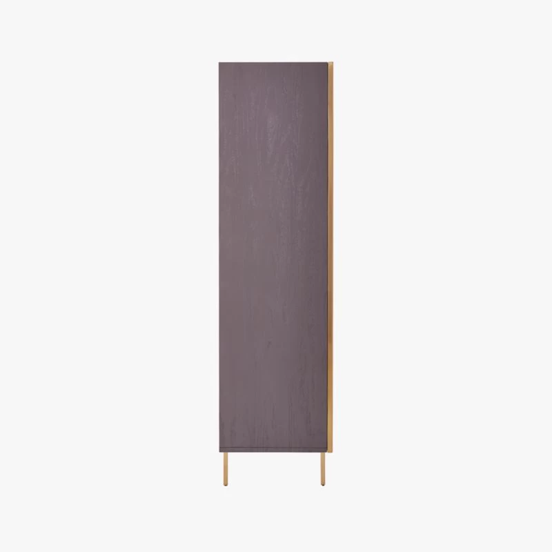 Designed by VUUE, modern brushed oak veneer frame takes on a Mad Men-esque vibe with two tall brass-plated fine wire mesh doors. Rich and textured, mesh creates a peek-a-boo effect, veiling books, objects and collectables in a bit of mystery. Four shelves rest inside the bookcase—the first and the fourth adjust, the middle two are fixed. Learn more about VUUE on our blog. CB2 exclusive.