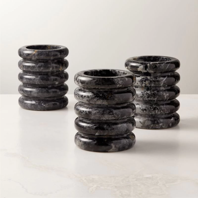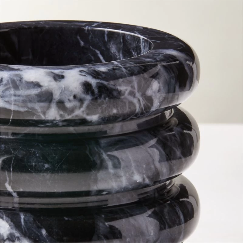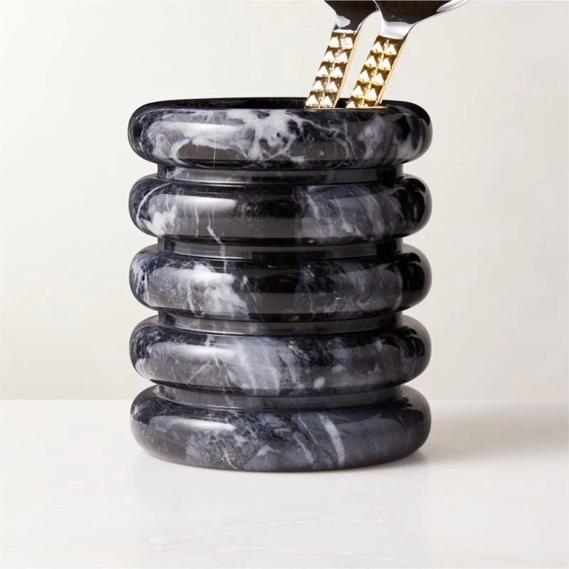 Sculpted tiers of black marble make a striking silhouette for kitchen utensils. Polished black marble with subtle swirls of white activity will vary from piece to piece, making each naturally one of a kind. Works beautifully as a wine chiller as well. CB2 exclusive.